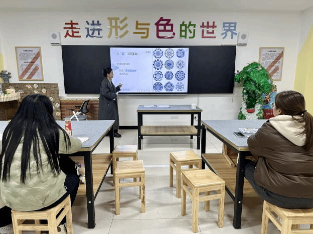青年教师王一丹以“幼儿教师美术技能”课程中“色彩明度“教学为内容,以青花瓷青色为切入点,通过融入AI工具赋能设计实践,搭建线上幼儿园模拟小展馆将学生作品数字化呈现,引导学生理解色彩明度及明度对比的视觉规律,助力学生感悟精益求精的工匠精神与传统文化。