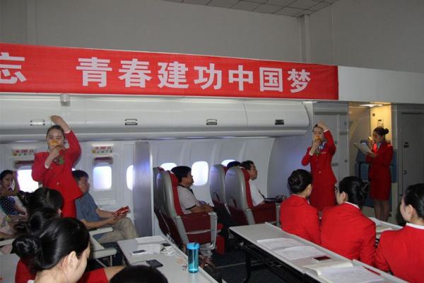 决赛由初赛胜出的两个乘务组进行乘务技能展示,他们身着整齐的制服,精心准备了点心、小吃、饮料及相关物品,认真地模拟了从迎接旅客登机到送旅客下机的全部服务过程,他们高水平的服务赢得了领导、老师的一致好评。
