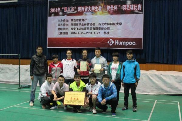4月25日至27日,由省教育厅主办,省学生体育协会、西北农林科技大学承办的2014年陕西省大学生暨“校长杯”羽毛球比赛在西北农林科技大学体育馆举行,我院获高职组第七名,体育教师张强获“优秀教练员”,穆艺江、牛玮娜两名学生获评“优秀运动员”。