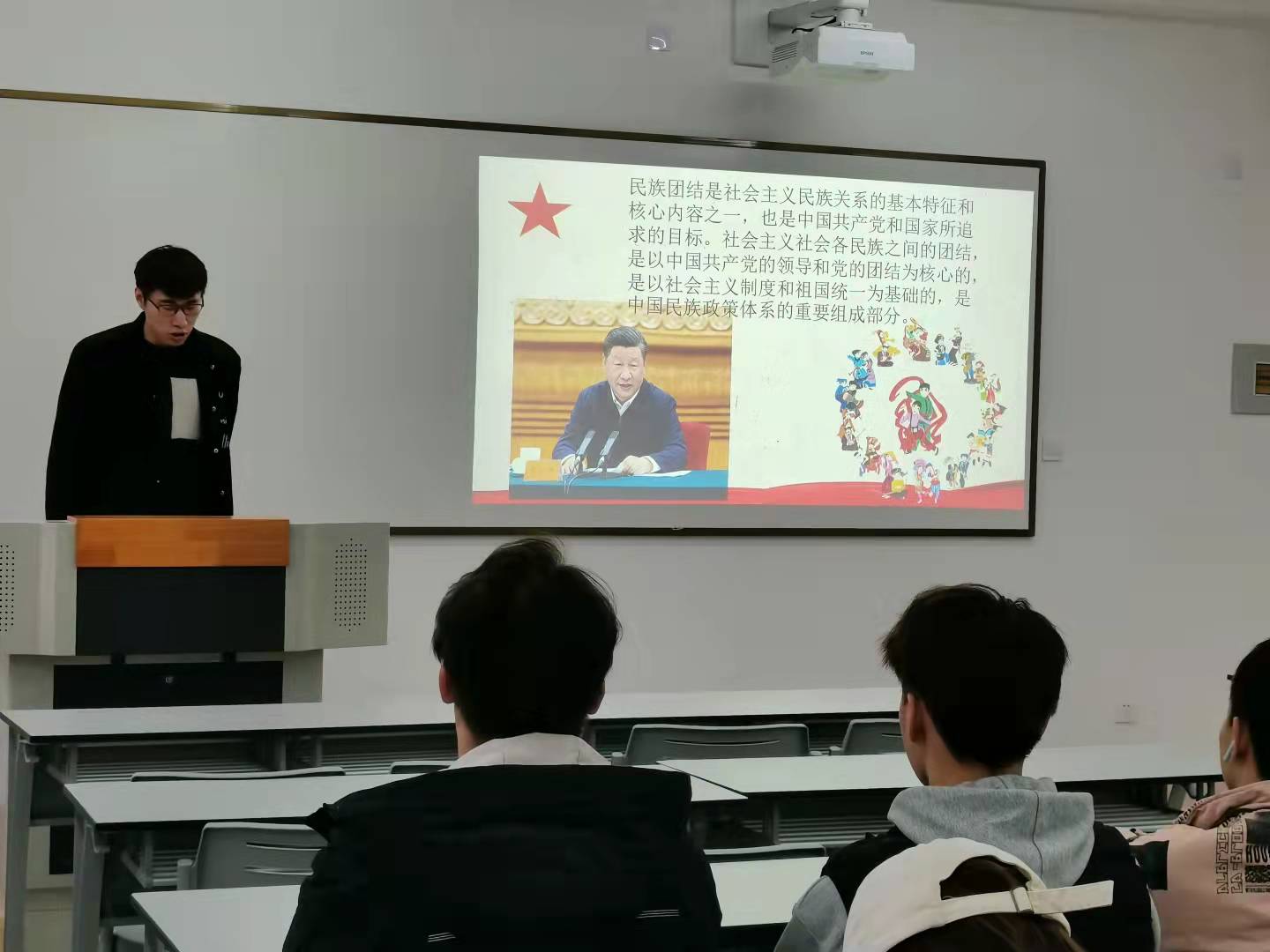主题班会活动中,各班组织学生观看《习近平出席中央民族工作会议并发表重要讲话》视频,深入学习领会习近平总书记关于民族工作的重要论述;同学们收集交流了身边关于民族团结的事迹,学习近年来各个行业、各条战线、各个领域涌现出的民族团结进步模范集体和模范个人的先进事迹;同时,辅导员、班主任围绕近年来民族团结先进事迹在班里进行了宣讲。